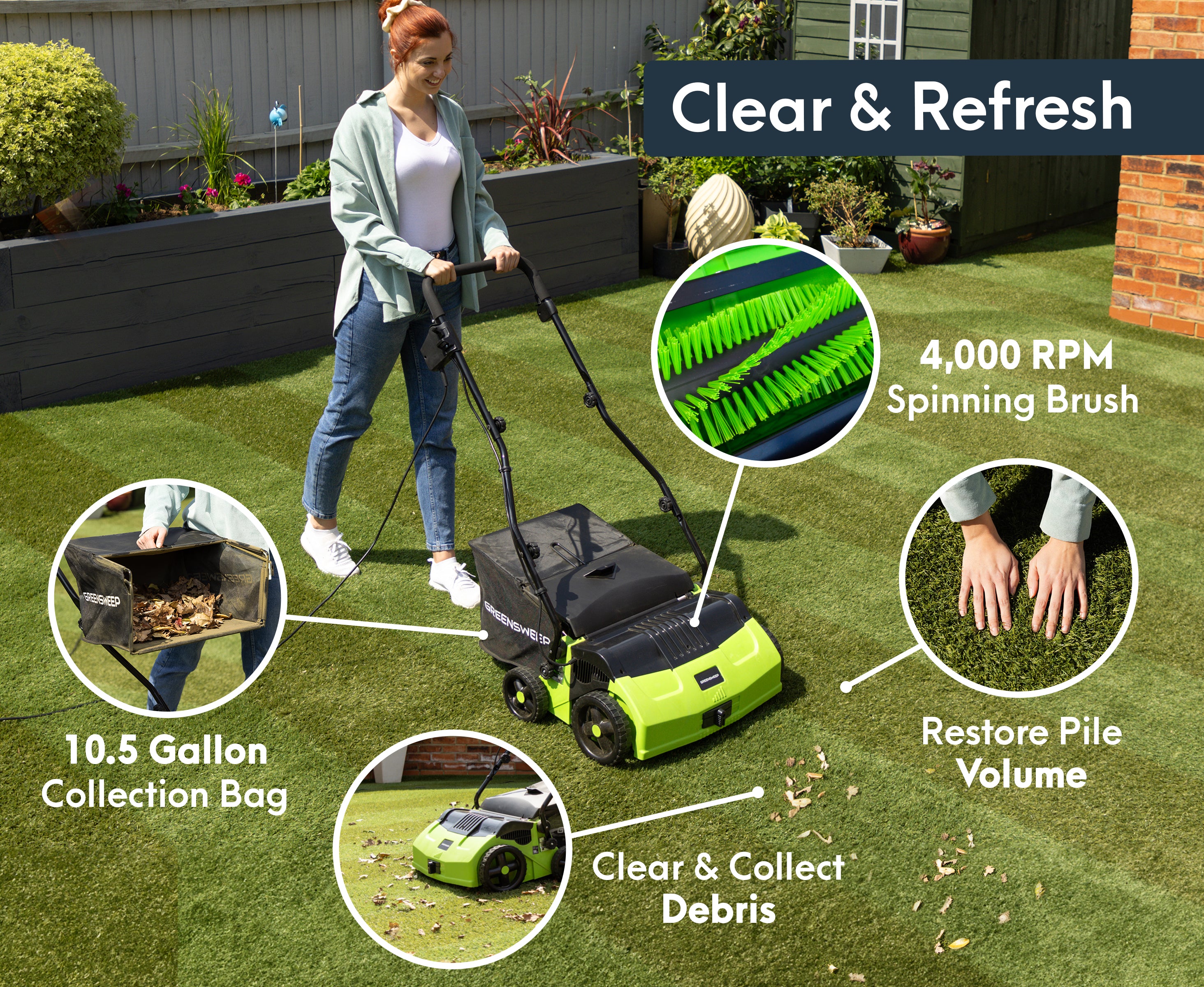 - PURPOSEFULLY POWERFUL: With a 1600W motor, the GreenSweep is capable of clearing large areas quickly and efficiently. The spinning brush propels the GreenSweep forward to make light work of your lawn care.