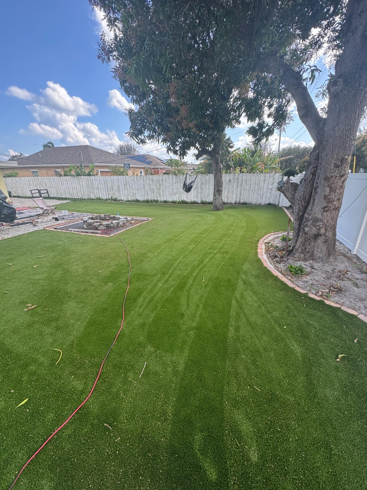 Many leaves, palm tree fronds, and pine needles getting stuck on the turf.